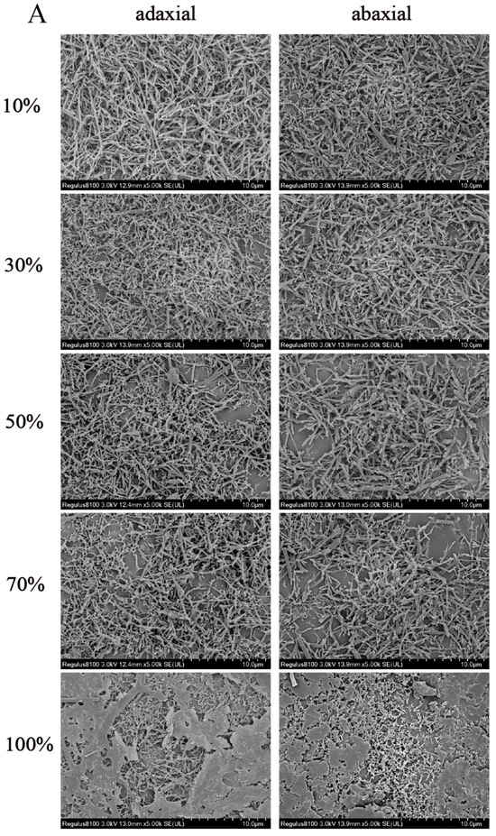 Effects of light intensity on the micromorphology of the epicuticular wax crystals on the leaf surfaces. (A) H. ‘Halcyon’; (B) H. ensata.