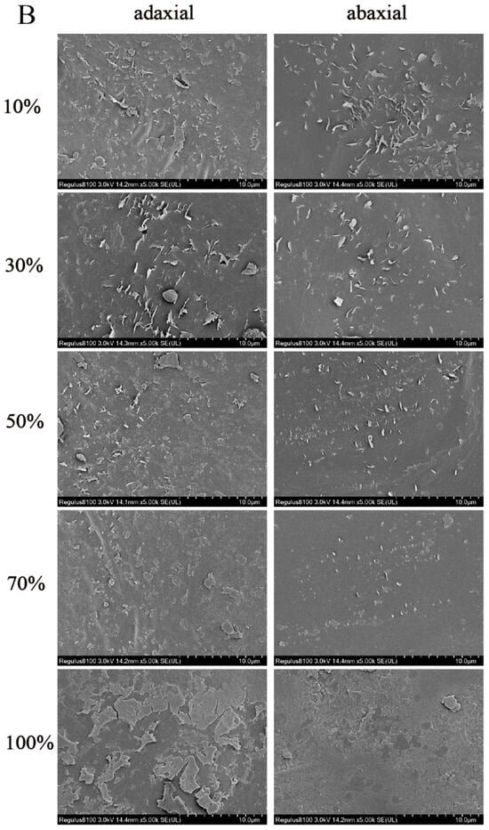 Light, as a major environmental factor, influences plant survival and growth. The relationship between plants and light has always been a core component of the fields of plant physiological and ecological research [,]. Epicuticular waxes coated at the outermost layer of the epidermis play a significant role in plant adaptation to light conditions [,,]. Barthlott et al. observed 13,000 epidermis samples belonging to different plant species through scanning electron microscopy and classified the micromorphology of wax into 26 types: filament, rodlet, platelet, tubular, and chimney, etc. Platelet and tubular were the most important types of wax crystal []. There are differences in the morphology of wax crystals on the leaf surfaces of different plant species. Moreover, the morphology of wax crystals varies with changes in environmental conditions. The abundance of tubular epidermal wax crystals on the adaxial leaf surface of Tragopogon pratensis L. reduced with the increase in light intensity []. Under UV-B stress, the wax content of Arabidopsis increased significantly; the wax crystals changed from rodlet to parallel flake, which could increase the coverage area of epicuticular wax for reducing transpiration and increasing leaf reflectance []. The wax crystals of the adaxial and abaxial of H. ‘Halcyon’ were tubular and very densely distributed, while those of H. ensata were platelet-like, and the distribution was sparse. With the increase in light intensity, the crystals of the epidermal wax of two species of Hosta gradually changed from dense to thin and melted to form crusts and fissured layers under high light intensity conditions. It is speculated that this is for the purpose of reducing transpiration and increasing reflectance. This plasticity of the micromorphology of the leaf epidermis is considered to be an acclimation of plants to light conditions.