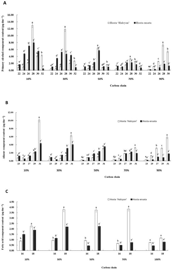 Effect of light intensity on the amount of epicuticular waxes in each wax class of two genotypes of Hosta. (A) Primary alcohol; (B) alkanes; (C) fatty acids; (D) diketones. Note: Data are mean ± SD (n = 3). Different letters (a–e) stand for obvious differences between the shade treatments at the level of p < 0.05. Different letters with an apostrophe (a′–e′) stand for obvious differences between the carbon chain lengths at the level of p < 0.05.