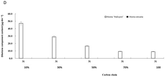 The primary alcohols of the epidermal wax constitution on the leaves of two species of Hosta were composed of a homologous series with even numbers of carbon atoms from C22 to C30, and the amount of C28 primary alcohols was significantly higher than that of other carbon atoms under different RLI conditions (p < 0.05). Moreover, most carbon atoms of primary alcohols on the leaf of H. ensata declined gradually with the increase in light intensity, which in H. ‘Halcyon’ showed the trend of reducing at first and then increasing with an RLI increase, achieving the lowest level at 70% RLI (Figure 2A). The alkanes of epidermal wax on the leaves of two species of Hosta were composed of a homologous series with odd numbers of carbon atoms from C23 to C31, and the C31 alkanes were the dominant wax compounds and were significantly higher than those of other carbon atoms (p < 0.05). The amount of C31 alkanes on the leaf surface of H. ensata declined gradually with the increase in light intensity, but those of H. ‘Halcyon’ showed the tendency to reduce at first and then enhance with an RLI increase, reaching the lowest level at 50% RLI (Figure 2B). The fatty acids contained carbon atoms of C16 and C18, and the C18 fatty acids were dominant under different RLI conditions (Figure 2C). The epicuticular waxes on the leaf surface of H. ‘Halcyon’ included large amounts of β-diketones identified as the carbon atoms of C31, which decreased gradually with the increase in light intensity and were not detected on the leaf surface of H. ensata (Figure 2D).