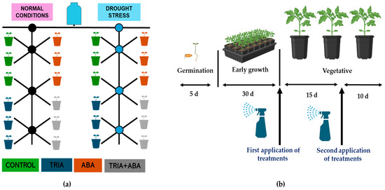 In the results obtained by Ramos-Zambrano et al. [20], TRIA influenced some physiological variables in S. lycopersicum under stress conditions when applied to the plants 30 and 45 days after early growth. Consequently, we employed a completely randomised design (Figure 1a) in the present study, with treatments applied foliarly to the entire plant for each treatment 30 and 45 days after early growth (Figure 1b). The design consisted of two factors with 3 repetitions per treatment, as shown in Table 1.