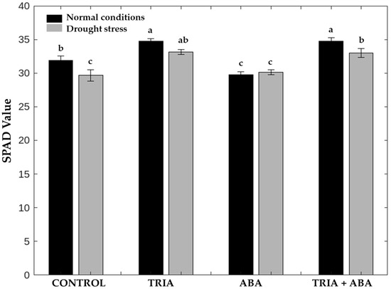 Chlorophyll content [SPAD] in plants exposed to two water flows (normal conditions and drought stress) and different treatments (Control, TRIA, ABA, and TRIA + ABA). Values represent the mean ± SE of at least three replicates. Different letters indicate significant differences, Fisher’s LSD, p < 0.05, in which treatments were the predominant factor.