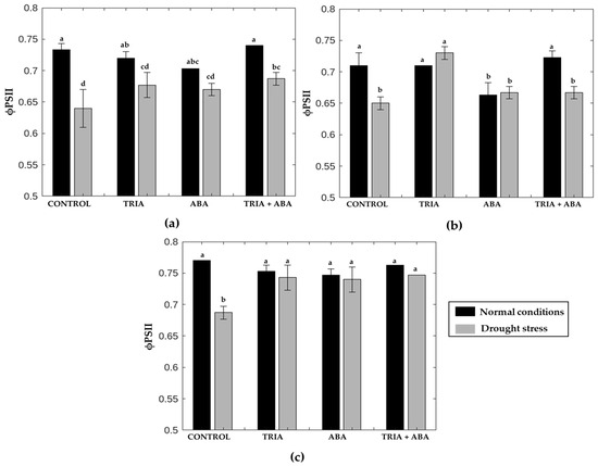 During the evaluated time periods, TRIA improved the operating efficiency of PSII photochemistry in plants under drought stress conditions. From 9 to 10 a.m., the ϕPSII values indicated that plants treated with TRIA began photosynthesis earlier than the control plants under drought stress conditions. Subsequently, this efficiency increased after 12–1 p.m. in plants treated with TRIA.