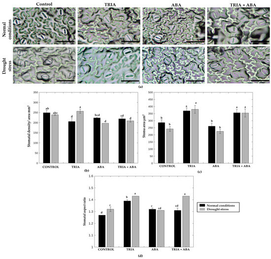 When ABA was applied, the stomatal area was 261.39 ± 20.69 µm2 and 224.97 ± 15.33 µm2, respectively, under normal and drought stress conditions, while TRIA + ABA treatment increased the stomatal area by 36.27% (356.21 ± 24.05 µm2) and 57.37% (354.04 ± 28.53 µm2), respectively, under normal conditions and drought stress (Figure 6a,c). The stomatal area increased significantly when TRIA was applied to plants under normal and drought stress conditions and reversed the effects of ABA. In addition, the aspect ratio showed greater stomatal opening in plants treated with TRIA under normal and drought stress conditions (Figure 6a,d).