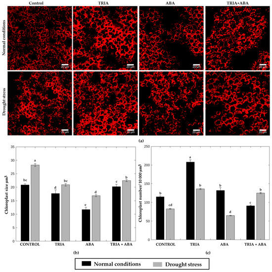 Although the volume of the chloroplasts was significantly greater in plants under TRIA treatment, their size was smaller than that of the chloroplasts in the control plants. Chloroplasts exposed to ABA exhibited a significantly reduced size when compared to those in the control and TRIA treatments under normal and drought stress conditions (Figure 7b). Due to the size of the chloroplasts, the number of chloroplasts was significantly greater under TRIA than under the other treatments (Figure 7c).
