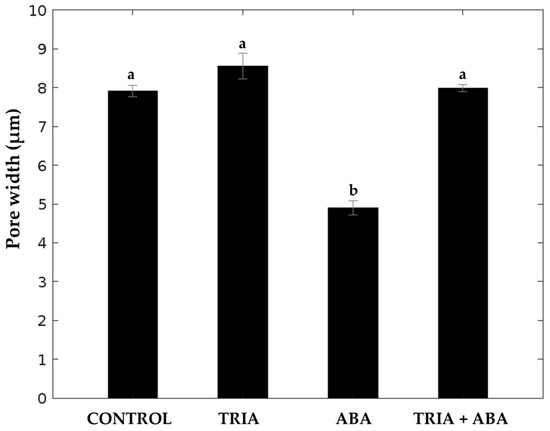 We also evaluated the effect that TRIA has on stomatal closure with ABA. Epidermal strips were floated in a buffer (30 mM KCl, 10 mM MES, pH 6.15) and exposed to light (250 mol m−2 s−1 PPFD) for 2 h to open the stomata. Once the stomata were open, the epidermal strips were transferred to the same buffer plus ABA (10 μM), ABA (10 μM) + TRIA (0.15 mM), and TRIA (0.15 mM). Samples were observed on a Zeiss LSM800 confocal laser scanning microscope (Carl Zeiss, Oberkochen, Germany). The autofluorescence emission signal was captured in the range of 410–595 nm (green fluorescence) using a 20×/0.5 EC lens. Images 2048 × 2048 pixels in size were obtained and stored in the TIFF format, and all stomata were analysed in triplicate [20].