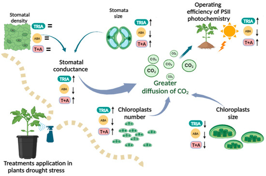 TRIA reversed the negative effects of drought stress on the physiological variables evaluated, including the chlorophyll content, operating efficiency of PSII photochemistry, stomatal conductance, and morphometric characteristics of stomata and chloroplasts. The size of the stomata was larger than in other treatments; consequently, greater stomatal conductance was identified. It can be concluded that TRIA leads to greater stomatal opening at an earlier age, resulting in an earlier start for photosynthesis, and thus offers advantages, compared to no TRIA treatment. These results suggest that plants have higher photosynthetic activity but also a longer photosynthesis time per day when treated with TRIA. Although the chloroplasts of plants exposed to TRIA were smaller than those of the control under both water flow conditions, this difference was related to improvements in photosystem II efficiency. In addition, TRIA reversed the negative effect of ABA by increasing the stomatal conductance, operating efficiency of PSII photochemistry, stomatal size, and chloroplast volume. Based on the results, it can be assumed that TRIA plays an important role in regulating stomatal opening and in the development of stomata and chloroplasts. These results also confirm TRIA’s selective role in regulating different pathways in plant metabolism, in response to stress, by inhibiting certain ABA-mediated responses.