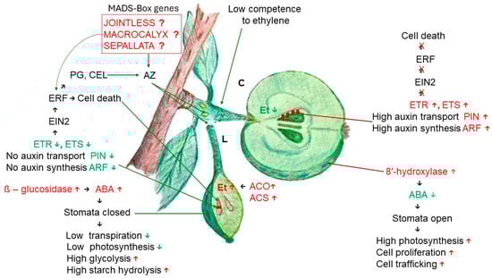 Abscission control is based on phytohormone and gene expression in central (C) and lateral (L) apple fruitlets. Red arrows indicate the increase, while green indicates the decrease in processes. ?—homologs in other plants but not confirmed in apple–trees.