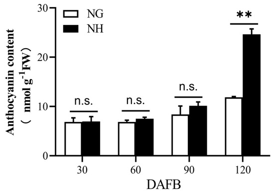 Anthocyanin contents of ‘NanGuo’ pear and ‘NanHong’ pear fruits. ‘NG’ is ‘NanGuo’ pear. ‘NH’ is ‘NanHong’ pear. By t test, n.s. stands for no significant difference, ** p < 0.01.