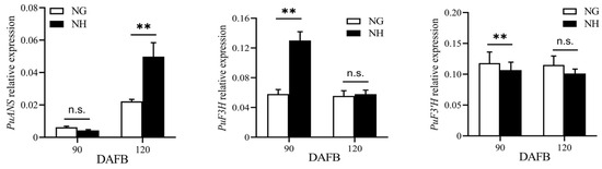 qRT-PCR was used to verify the expression levels of genes related to anthocyanin synthesis in ‘NanGuo’ pear and ‘Nanhong’ pear at 90 and 120 DAFB, respectively. By t test, n.s. stands for no significant difference, ** p < 0.01.