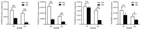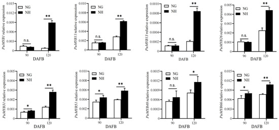 qRT-PCR was used to verify the expression levels of MYB genes at 90 and 120 DAFB of ‘NanGuo’ pear and ‘NanHong’ pear, respectively (consistent with anthocyanin accumulation trend). By t test, n.s. stands for no significant difference, * p < 0.05, ** p < 0.01.