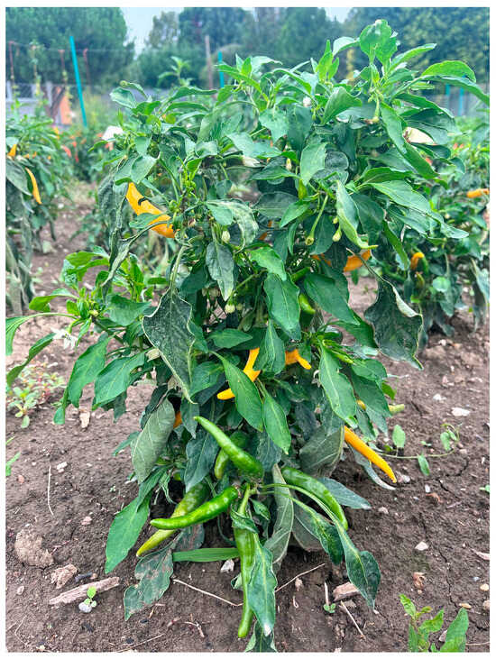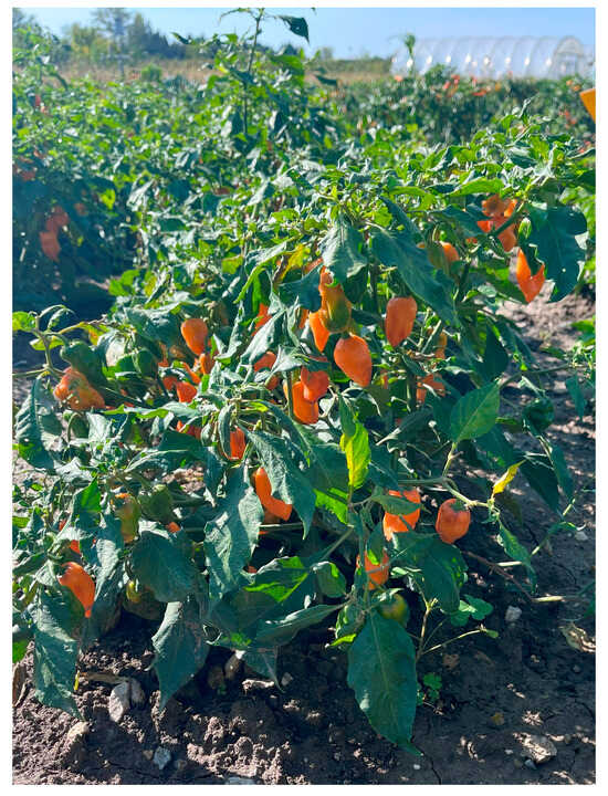 For the study, two different species of chili peppers were selected. Capsicum chinense variety ‘Habanero Orange’ (Figure 1) is a branched lower plant, with lantern-shaped orange fruits that measure 4–7 cm. These chili peppers reach about 600,000 SHU. The second species is Capsicum annuum variety ‘Kristian’ (Figure 2). Fruits of this plant are thin, medium–long, and yellow in color. On the Scoville scale, these peppers reach approximately 50,000–60,000 SHU. The seeds of the pepper varieties were obtained from the company SEMO a.s. (Czech Republic) and the seedlings were grown in the greenhouses of the Botanical Garden at the Slovak University of Agriculture in Nitra.