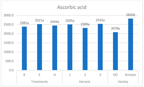 Influence of biostimulants, harvest, and variety on ascorbic acid content in chili peppers (mg·kg−1 FM). AA—ascorbic acid; FM—fresh matter; K—control treatment; E—treatment with application of the biostimulant Energen; H—treatment with application of the biostimulant Humix; HO—‘Habanero Orange’. Different letters demonstrate statistically significant differences at p ≤ 0.05.