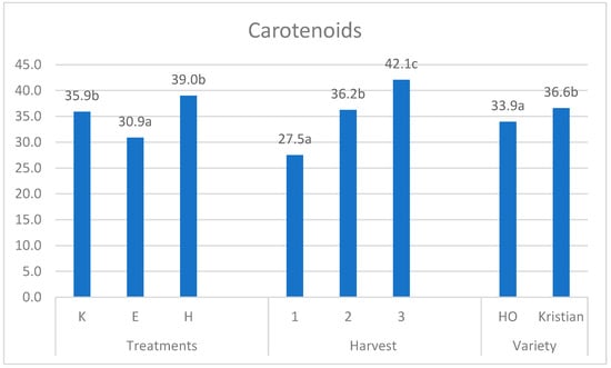 Influence of biostimulants, harvest, and variety on carotenoid content in chili peppers (mg·kg−1 FM). FM—fresh matter; K—control treatment; E—treatment with application of the biostimulant Energen; H—treatment with application of the biostimulant Humix; HO—‘Habanero Orange’. Different letters demonstrate statistically significant differences at p ≤ 0.05.
