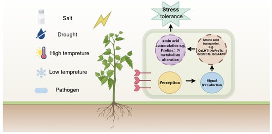 Proline is involved in multiple mechanisms to avoid the adverse effects of abiotic stress on plants. These mechanisms range from regulating osmotic balance to forming reactive oxygen species (ROS) according to the stressor []. Salt and drought stress promote proline production and inhibit its degradation []. Several amino acid transporters, such as ProTs, AAPs, and LHTs, transport proline, which can enhance plant stress resistance [,,,,] (Figure 2). For example, the HvProT genes are highly expressed in root cap cells under salt stress in barley []. In soybean, the GmProT1 and GmProT2 genes are strongly induced by salt, drought, and abscisic acid (ABA) treatments. Overexpressing GmProT1 or GmProT2 in Arabidopsis results in more proline accumulation, elevated stress-related gene expression, and higher salt and drought resistance than wild-type plants under salt and drought stress []. Moreover, GmAAP6 encodes ay N deficiency-responsive amino acid permease in soybean, and its overexpression in Arabidopsis and soybean results in elevated tolerance to N limitation [].