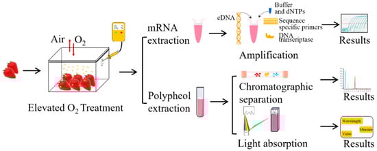 Previous studies have argued in favor of modification atmosphere packaging (MAP) due to its physical mode of action [3], which is more environmentally friendly and viewed as healthier for consumers in comparison to edible coatings [4], melatonin [5], and other chemical treatments. Gong et al. [6] found that strawberries treated with a combination of 2.5% O2 and 15% CO2 had shelf lives 4–6 d longer than controls. In addition, Li et al. [7] found that treatment with 20% CO2 could delay the accumulation of aromatic secondary metabolites, providing insight into the maintenance of postharvest strawberry quality during storage. Even so, low O2 storage conditions can result in the production of acetaldehyde and ethanol [8], producing an unpleasant alcohol smell. However, elevated O2 storage conditions have shown promise in maintaining fruit quality. Wei et al. (2018) found that high O2 (50% or 100%) resulted in increased polyphenol contents during the initial stages after wounding in kiwis and provided substrates for wound healing in later stages [9]. Chen et al. (2018) also found that high O2 (50%, 70%, or 90%) resulted in the maintenance of fruit quality and increased the polyphenol contents of passion fruits during the storage process [10]. Similar results were obtained with oranges [11] and mulberries [12]. Additionally, strawberries exposed to high O2 showed lower rates of decay, higher firmness, and higher total phenolic contents than those exposed to normal air, which demonstrated that elevated O2 contributed to the maintenance of strawberry quality [13]. That said, the aforementioned studies did not explicitly assess the polyphenol contents of strawberries at the molecular level when exposed to a range of elevated oxygen concentrations.