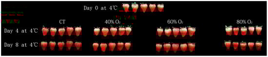 The morphologies of strawberries at various timepoints during the storage period are shown in Figure 2. In general, the color of all fruits developed from white to red during the storage period. Fruits treated with high concentrations of oxygen were brighter in color compared to CT strawberries, especially in the 60% and 80% O2 treatment groups. At 8 d of storage, the strawberry fruits of all the other groups had a dark red color, and only the 80% O2 treatment group was able to maintain the bright color of the strawberry fruits. It is speculated that the high oxygen treatment may have maintained the content of related metabolites, resulting in a better appearance of the fruit.