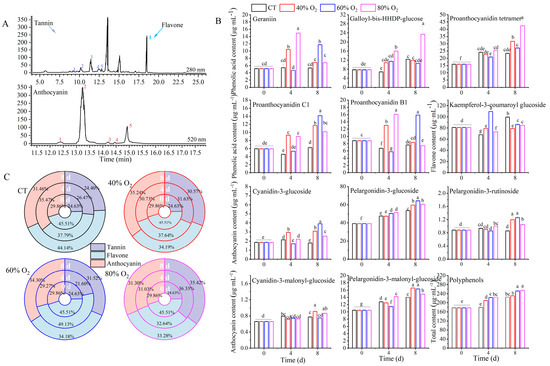 Effect of elevated oxygen on polyphenol contents, including tannins, a flavone, and anthocyanins, during cold storage. (A) Chromatograms of polyphenols; (B) contents of individual tannins, a flavone, anthocyanins, and total polyphenols; and (C) proportions of tannins, a flavone, and anthocyanins. Values are presented as means ± standard deviation (n = 3). Different letters indicate significant differences between groups (p < 0.05).
