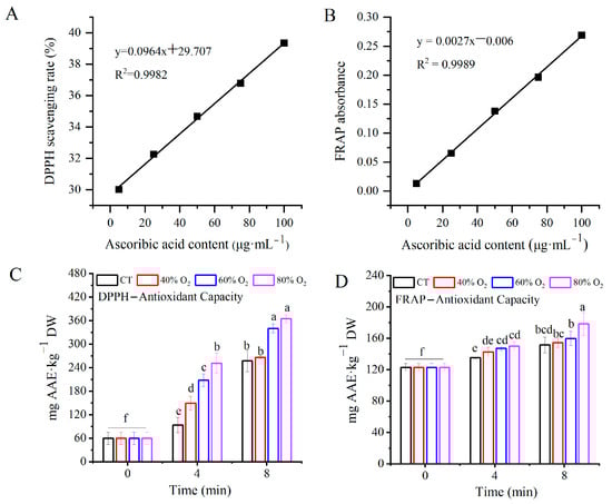 Standard curves of DPPH scavenging capacity (Figure 4A) and FRAP reducing capacity (Figure 4B) were first generated to facilitate the determination of the corresponding antioxidant capacities of strawberries treated with elevated O2 during cold storage, as shown in Figure 4C,D. DPPH scavenging capacities generally increased with storage time and increased oxygen concentrations (Figure 4C), which was consistent with changes in polyphenol contents (Figure 3B). By the end of storage, the ascorbic acid equivalent (AAE) levels of strawberries with 60% O2 and 80% O2 treatments were 1.32-fold and 1.42-fold higher, respectively, than that of CT. FRAP reducing capacities similarly increased with storage time and increased oxygen (Figure 4D). On day 8, the FRAP reducing capacities of strawberries with 80% O2 treatments were 1.18-fold higher than that of CT. Different polyphenol substances have slightly different changes. The changes in tannins and anthocyanins are consistent with the trend of the changes in antioxidant activity, while the trend of the changes in flavonoids is different. Perhaps different substances in the phenylpropane metabolic pathway have different metabolic rates.
