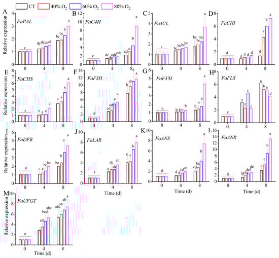 Effect of elevated oxygen on the expression levels of genes involved in the polyphenol biosynthesis pathway. Expression values are presented as means ± standard deviation (n = 3). Different letters indicate significant differences between groups (p < 0.05). Gene names are abbreviated as follows: (A) PAL, phenylalanine ammonia lyase; (B) C4H, cinnamic acid 4-hydroxylase; (C) 4CL, 4-coumarate–CoA ligase; (D) CHI, chalcone isomerase; (E) CHS, chalcone synthase; (F) F3H, flavanone 3-hydroxylase; (G) F3ʹH, flavanone 3ʹ-hydroxylase; (H) FLS, flavonol synthase; (I) DFR, dihydroflavonol 4-reductase; (J) LAR, leucoanthocyanidin reductase; (K) ANS, anthocyanidin synthase; (L) ANR, anthocyanidin reductase; and (M) UFGT, UDP-glucose flavonoid 3-O-glucosyltransferase.