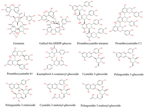 General structures of tannins, a flavone, and anthocyanins identified in strawberries. Among these, geranin, galloyl-bis-HHDP-glucose, proanthocyanidin tetramer, proanthocyanidin C1, and proanthocyanidin B1 are tannins; kaempferol-3-coumaroyl glucoside is a flavone; and cyanidin 3-glucoside, pelargonidin 3-glucoside, pelargonidin 3-rutinoside, cyanidin 3-malonyl-glucoside, and pelargonidin 3-malonyl-glucoside are anthocyanins.