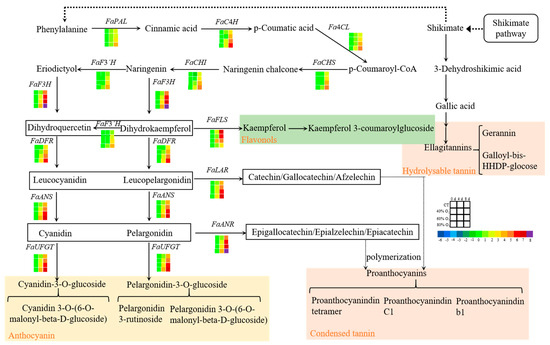 As shown in Table 1 and Figure 3A, five tannins, one flavone, and five anthocyanins were identified in strawberries via mass spectrometry. Strawberry tannins in this study consisted of hydrolyzable tannins (geranin and galloyl-bis-HHDP-glucose) and condensed tannins (proanthocyanidin tetramer, proanthocyanidin C1, and proanthocyanidin B1) (Figure 3B). Individual tannin contents generally increased with storage time, except for geranin and proanthocyanidin B1 in CT, 40% O2, and 80% O2 treatment groups. Peak geranin and proanthocyanidin B1 contents in these treatment groups were observed on the 4th day of storage. Total tannin contents were generally higher in the elevated O2 treatment groups compared to the CT group. At the end of storage, total tannin contents for the 40% O2, 60% O2, and 80% O2 treatments were 1.28-fold, 1.44-fold, and 1.64-fold higher, respectively, than those of CT (Figure 3B). The contents of the flavone kaempferol-3-coumaroyl glucoside were higher in the elevated O2 groups than in CT on the 4th day of storage, especially with 60% O2, although the content in the CT group was higher on the 8th day. On the 4th day, kaempferol-3-coumaroyl glucoside contents for the 40% O2, 60% O2, and 80% O2 treatments were 1.16-fold, 1.61-fold, and 1.08-fold higher, respectively, than that of the CT group (Figure 3B). At the end of storage, total anthocyanin contents of strawberries with 40% O2, 60% O2, and 80% O2 treatments were 1.15-fold, 1.22-fold, and 1.13-fold higher, respectively, than those of the CT group. Furthermore, there was a general increase in the proportion of anthocyanins in the 40% O2 and 60% O2 treatment groups over time, which was particularly evident at the end of storage on 8 d. (Figure 3C). The proportions of flavone generally decreased and the proportions of tannins, especially condensed tannins, generally increased in elevated oxygen treatment groups with storage time, while the opposite was observed in the CT group. The accumulation of polyphenol compounds in fruits is an adaptive mechanism to prevent oxidative damage to cells by providing hydrogen and peroxides to enhance the fruits’ antioxidant activity. This may be due to the accelerated changes in cell membrane composition and structure caused by elevated oxygen treatments, resulting in a large accumulation of polyphenol compounds in strawberry fruits, thereby improving fruit quality.