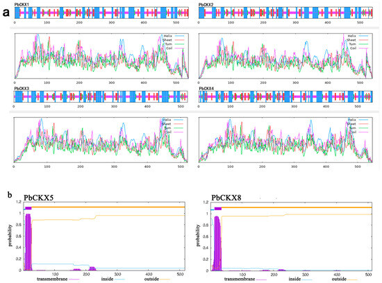 Transmembrane region and multistage structure of PbCKX protein. (a) Secondary structure distribution of PbCKX protein. (b) Prediction of PbCKX protein transmembrane structure. Purple indicates possible transmembrane regions. (For detailed information, please refer to the Supplementary Materials.) (c) Tertiary structure of PbCKX protein.