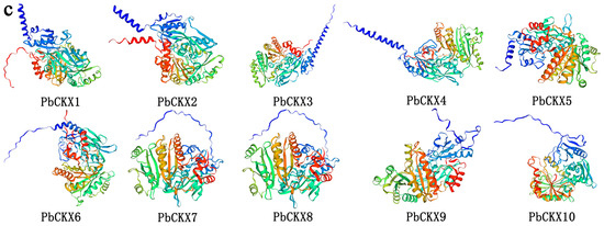 Analysis using TMHMMServer v.2.0 suggested that the CKX proteins PbCKX5 and PbCKX8 in ‘duli’ may contain transmembrane domains (Figure 1b), indicating their potential involvement in transmembrane signal transduction and material transport within pear cells. Secondary structure analysis using the SPOMA platform revealed that random coils made up the largest proportion of protein structures in this family (Table 2, Figure 1a), ranging from 39.77% to 43.12%, followed by alpha-helices, which accounted for 32.50% to 36.92%. Beta turns represented the smallest structural proportion, ranging from 5.02% to 7.27%. Subcellular localization predictions suggested that PbCKX3, PbCKX4, and PbCKX9 are localized within vacuoles, while PbCKX1, PbCKX5, and PbCKX6 exhibited dual localization in the cytoplasm and extracellular matrix. Tertiary structure predictions (Figure 1c) indicated structural similarities between certain pairs: PbCKX1 and PbCKX2, PbCKX6 and PbCKX10, PbCKX7 and PbCKX8, and PbCKX3 and PbCKX4, suggesting potential functional similarities. In contrast, other members exhibited distinct three-dimensional structures, pointing to variability in their regulatory mechanisms and functions within the pear species.