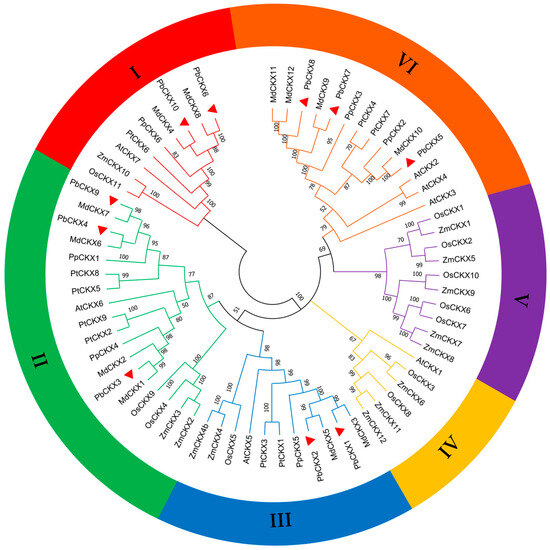 Evolutionary relationship analysis of CKXs from seven plant species. Pyrus betulifolia Bunge, Pb; Malus x domestica, Md; Arabidopsis thaliana, At; Oryza sativa, Os; Zea mays, Zm; Populus trichocarpa, Pt; Prunus persica, Pp. The CKX gene family is divided into six groups, represented by lines and patches of different colors. The PbCKX gene is highlighted with a red triangle.