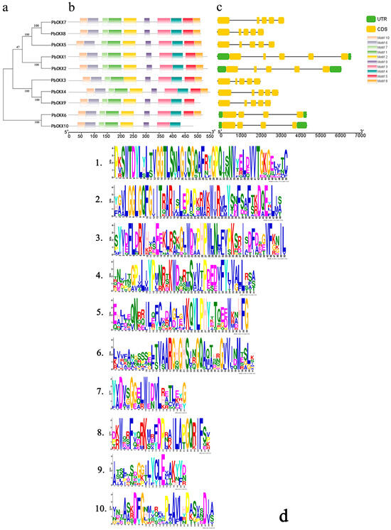 (a) Phylogenetic taxonomic phylogenetic tree of PbCKXs. (b) Conservative motif analysis of PbCKXs. The motif position is represented by a combinatorial block diagram, and the rectangles of different colors represent different motifs. (c) Gene structure analysis of PbCKXs: UTR region (green), exon (yellow), intron (black line). (d) Amino acid composition of each motif.