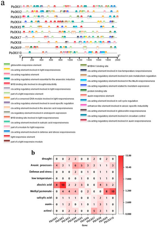 The distribution and quantity of cis-acting elements in the PbCKX gene family of ‘duli’. (a) Distribution of cis-acting elements. (b) Quantity of cis-acting elements, with red representing the quantity of cis-acting elements.