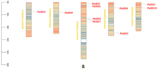 Chromosome mapping revealed that the PbCKX genes (Figure 5a) are distributed across several chromosomes: PbCKX1 and PbCKX10 are located on chromosome 8, PbCKX4 on chromosome 12, PbCKX9 on chromosome 14, and PbCKX2, PbCKX6, PbCKX5, and PbCKX7 on chromosome 15. Additionally, PbCKX3 and PbCKX8 are located on chromosome 2, with PbCKX5 and PbCKX7 positioned closely on chromosome 15.