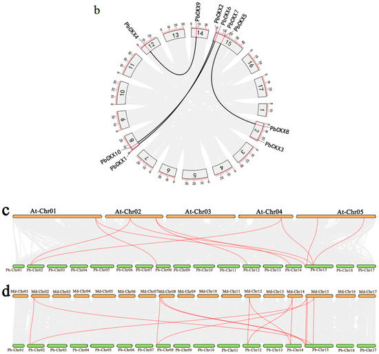 (a) Chromosomal mapping of the PbCKX gene. Only chromosomes containing the CKX gene are shown, and the chromosomal position of each PbCKX gene is shown on the corresponding chromosome from top to bottom according to the ‘duli’ genome. The lines in the chromosomes indicate the gene density. The value on the Y-axis represents the length of the chromosome. Each chromosome is marked to the left with a chromosome number. (b) Collinear distribution of PbCKX gene within species. (c,d) The CKX genes of ‘duli’, Malus, and Arabidopsis thaliana exhibit a collinear distribution. In the representation, orange denotes the chromosomes of Arabidopsis thaliana (At) and Malus (Md), while green indicates the chromosomes of ‘duli’ (Pb). The red lines illustrate the connections between the collinear CKX genes.