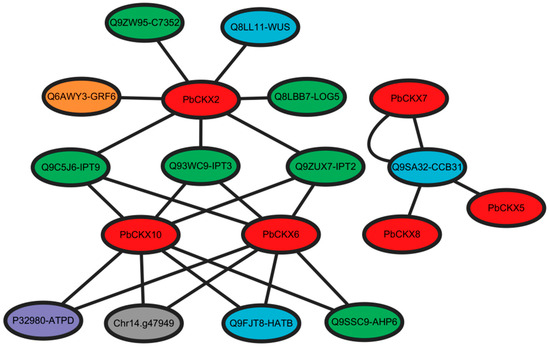 To further understand the biological roles and regulatory networks associated with the PbCKX gene family, homology-based methods were used to predict PPI involving PbCKX (Figure 6). A total of 12 functional genes were identified as interacting partners for PbCKX2, PbCKX5, PbCKX6, PbCKX7, PbCKX8, and PbCKX10. Most of the proteins interacting with PbCKX are involved in CK synthesis, metabolism, and signal-transduction pathways. These include isopentenyltransferase (IPT), phosphotransfer proteins (AHP), cytokinin riboside 5′-monophosphate ribose hydrolase (LOG), and cytochrome P450 cytokinin hydroxylase (CYP735A2). Additionally, interactions between CKX proteins and enzymes or transcription factors related to photosynthesis, cell division, and brassinosteroid signaling pathways were identified. Notably, PbCKX2 was found to interact with PbCKX6 and PbCKX10 through IPT2, IPT3, and IPT9. Furthermore, interactions were observed between PbCKX5, PbCKX7, and PbCKX8 with the mitotic cycle-related protein CCB31, suggesting a complex network of interactions among these proteins.