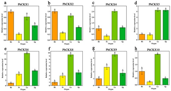 Relative expression levels of PbCKX gene family in some members of different organs of ‘duli’: Rt, root; St, stem; Le, leaf; and Sp, Crown. All transcript levels were normalized to the corresponding levels in Rt. The lowercase letters indicate significant differences (p < 0.05, number of samples = 3).