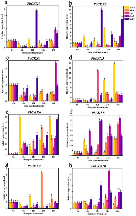The relative expression levels of some members of the PbCKX gene family during exogenous hormone and stress treatments. Yellow (6-BA), orange (ABA), purple (IAA), purple (GA3), and blue (salt) represent different treatments. The lowercase letters indicate significant differences (p < 0.05, number of samples = 3).