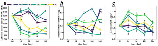 Additionally, exogenous hormones and NaCl also influenced the endogenous levels of iP and ZR in the leaves (Figure 9b,c). ABA treatment significantly decreased endogenous iP and ZR levels, with the exception of an increase in ZR content observed on the 20th day. NaCl treatment caused a significant reduction in iP content after 10 days, and a marked decrease in ZR content was noted on the 10th day. No significant differences were detected for other treatment durations compared to the control. In contrast, treatments with 6-BA and IAA significantly increased endogenous iP levels in the leaves 10 days before treatment; however, by the 20th day, iP levels were significantly lower than those of the control, while ZR content was significantly higher compared to the control on the 20th day before treatment. The effects of exogenous GA3 on endogenous iP and ZR levels were variable; GA3 treatment significantly reduced iP content on the 20th day while simultaneously leading to a significant increase in endogenous ZR content before the 20th day.