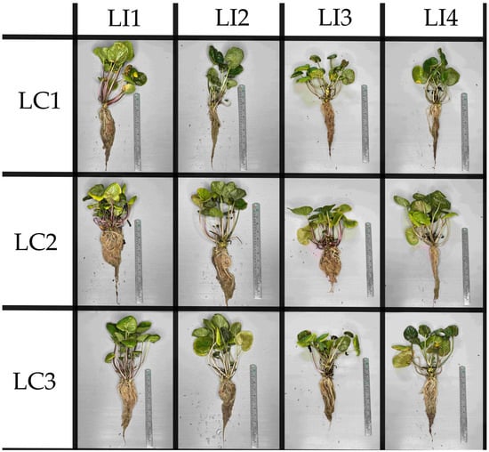 Wasabi ‘Daruma’ growth characteristics at the harvest stage (44 weeks after treatment) under different LED light combinations and intensities. LC = light combination; LC1 = red (1:1), LC2 = red: white: blue (1:1:1), LC3 = white. LI = light intensity; LI1, LI2, LI3, and LI4 correspond to 140, 90, 60, and 35 µmol m⁻2 s⁻1, respectively.