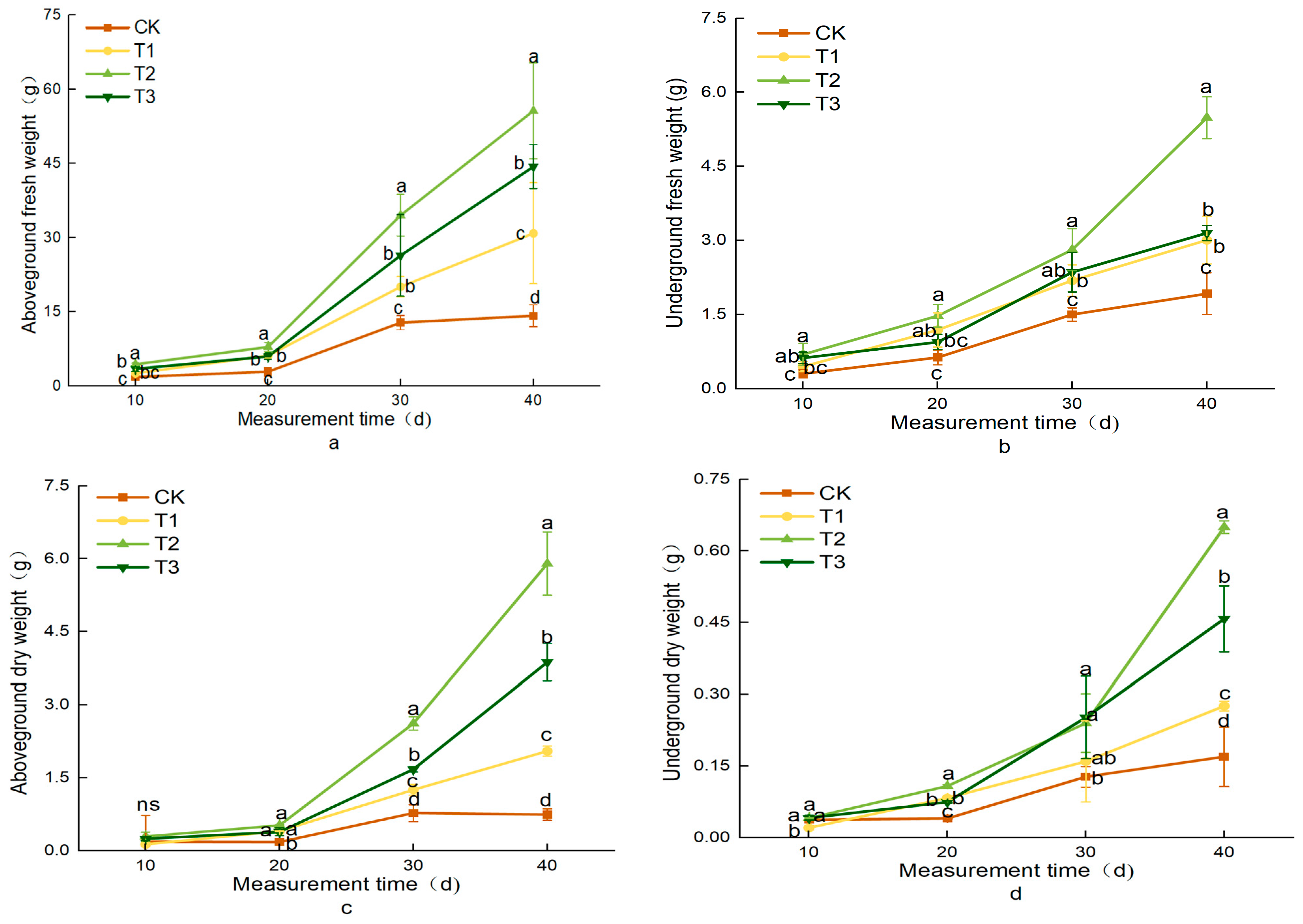 | Treatment | Aboveground Fresh Weight (g) | Underground Fresh Weight (g) | Aboveground Dry Weight (g) | Underground Dry Weight (g) |