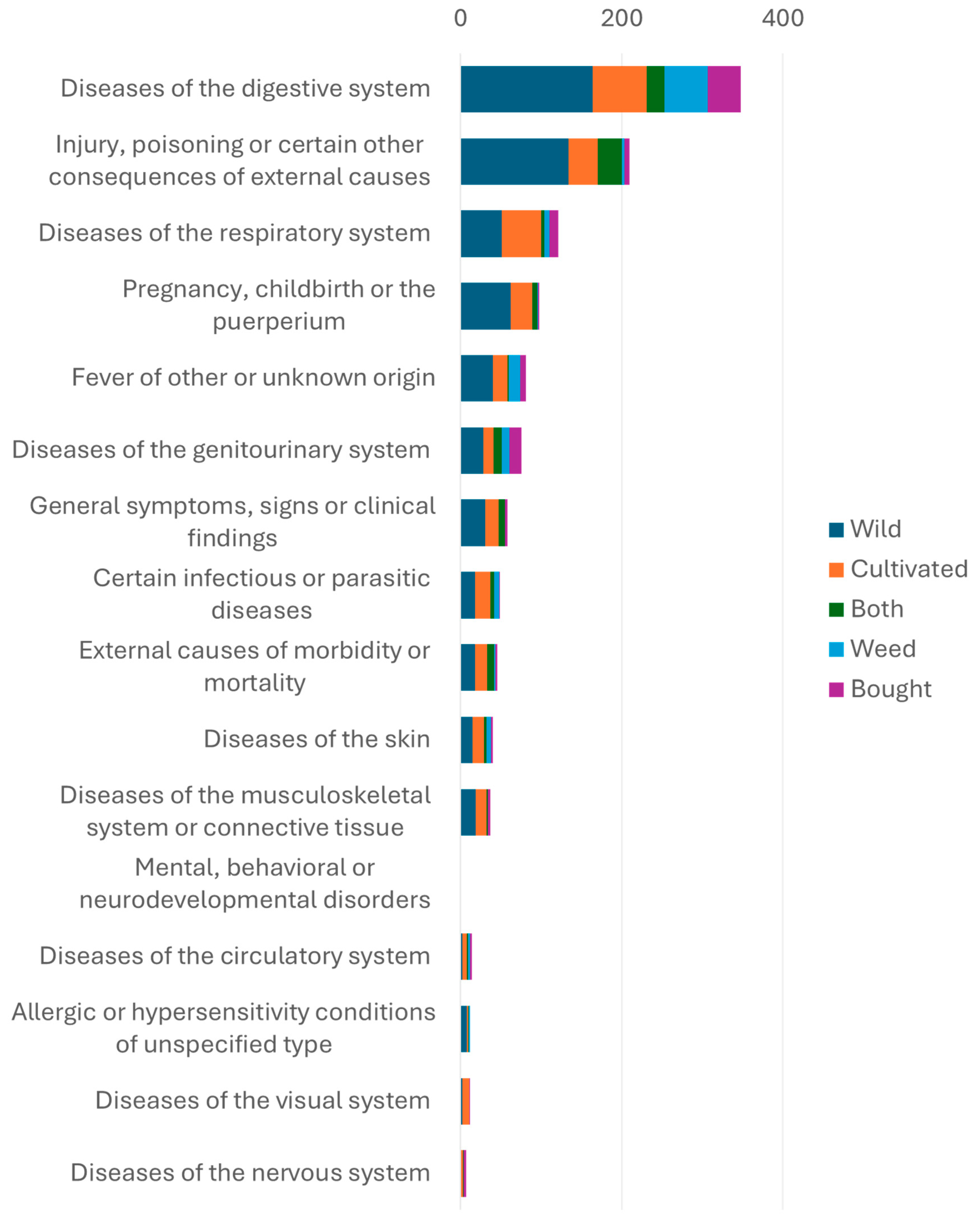 Regarding the utilization of different plant parts, leaves demonstrated clear predominance, being employed in 50% of cases. Flowers constituted the second most frequently used organ (10%), followed by fruits, shoots, bulbs, tubers, and other plant structures in smaller proportions.
