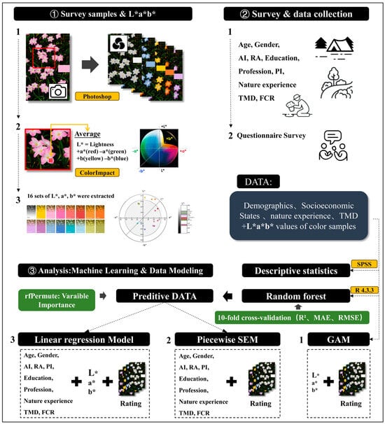 Building on related work, we developed a more scientific research framework to study and predict flower color preferences (Figure 1). This framework is divided into three parts, with Table A1 listing the related software and versions used. The first part concerns the survey samples. We used the L*, a*, and b* values from the CIELAB color system to quantify flower colors, thus transforming categorical variables into continuous variables. Photos of Zephyranthes ‘Lily Pies’ were taken under natural light with a simplified background to minimize distractions. Photoshop (2018) was used to adjust the flower colors in the photos to the target colors, thereby generating sample images for the questionnaire. The second part was the questionnaire survey. We surveyed participants’ demographic characteristics, nature experience, and emotional states. The third part involved data processing. In the data preprocessing stage, the machine learning method of random forests was utilized for data prediction. This step aimed to capture potential features to increase the amount of information and enhance the robustness of the subsequent modeling. The data analysis was divided into four steps: