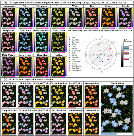 Images of 16 single-color flowers (a) and 13 mixed two single-color flowers (c), range: L* (0_100), a* (−128_127), b* (−128_127). Laboratory value coordinates of single-color flowers in CIELAB (b). The original image was taken by the author, and the other samples were created by the author.