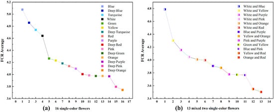 The average FCR of the general public for 16 single-color flowers (a) and 13 mixed two single-color flowers (b).