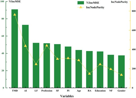 Variable importance in predicting FCR. %IncMSE indicates the impact of a variable on the prediction error of the model, and IncNodePurity indicates the role of a variable in improving the purity of nodes in the decision tree. (RA: residential area; TMD: total mood disturbance; PI: personal source of income; AI: annual household income level; SF: small park visit frequency; LF: large park visit frequency; NF: nature visit frequency.)