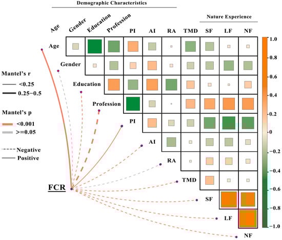Correlation between demographic characteristics, TMD, nature experience (SF, LF, NF) and FCR using Mantel’s test and Pearson’s correlation analysis.