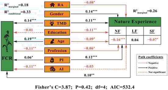 Piecewise SEM was used to explore the direct and indirect effects of the factors identified in the previous step on FCR (Figure 6). The variance inflation factor (VIF) values for the three segmented models were below 3, indicating no severe collinearity among the independent variables (Table A5). When considering the random effects of the different color images, the selected variables explained 33% of the total variation in FCR (R2 conditional = 0.33, Figure 6). Notably, nature experience (SF, LF, NF) had a significant positive impact on FCR (λ = −0.10, p < 0.01). Specifically, SF and NF had significant negative impacts on FCR independently (λSF = −0.07, pSF < 0.05; λNF = −0.16, pNF < 0.001), while the impact of LF on FCR was not significant (λ = 0.04, p > 0.05). Additionally, age (λ = 0.19, p < 0.001), AI (λ = −0.11, p < 0.01), profession (λ = −0.11, p < 0.01), PI (λ = 0.06, p < 0.05), and TMD (λ = 0.14, p < 0.001) all had significant effects on FCR, whereas education did not show a significant impact on FCR (λ = 0.01, p > 0.05). The FVP was also significantly affected by some demographic factors (R2 marginal = 0.26, Figure 6). The piecewise SEM met the statistical standards based on Fisher’s C test (Fisher’s C = 3.87, p-value = 0.42, AIC = 532.4), with four degrees of freedom in the model.