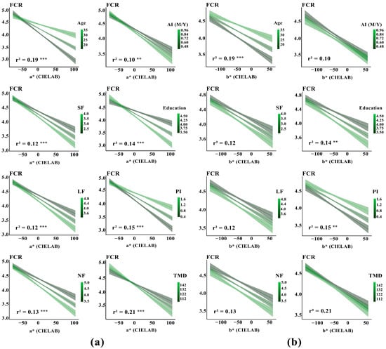 Adding a* and b* as interaction terms in the linear regression model revealed the independent effects of certain factors on FCR (Figure 7). The results indicate that in the absence of other variables, the interaction of age with a* and b* had a significant positive impact on FCR (r2 = 0.19, pa < 0.001, pb < 0.001); the interaction of PI with a* and b* also significantly positively influenced FCR (r2 = 0.15, pa < 0.001, pb < 0.01). This suggests that FCR tends to increase when the levels of age and PI increase along with a* and b*. Moreover, the interaction of education with a* and b* had a significant negative effect on FCR (r2 = 0.14, pa < 0.001, pb < 0.01). The interaction of AI with a* significantly negatively impacted FCR (r2 = 0.10, pa < 0.01).