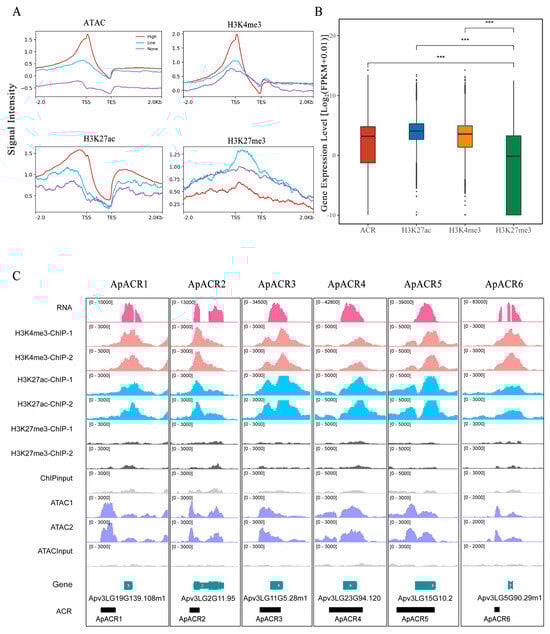 The genomic features of six selected ApACRs. (A) Correlation between gene expression level and four genomic features (ACR, H3K4me3, H3K27ac, and H3K27me3). Genes with high, low, and no expression were represented by FPKM ≥ 1, 0 < FPKM < 1, and FPKM = 0, respectively. FPKM: fragments per kilobase of transcript per million mapped reads; TSS: transcription start site; TES: transcription termination site. (B) Comparison of expression levels of genes modified by ACRs, H3K27ac, H3K4me3, and H3K27me3, respectively. Significant differences in gene expression levels were observed in genes associated with three active epigenetic signals (ACR, H3K27ac, and H3K4me3), compared with the repressive mark H3K27me3. (C) IGV screenshot showing genomic features of candidate ApACRs, which were associated with relatively high levels of gene expression and active histone modifications signals (H3K27ac and H3K4me3), except for H3K27me3. (***) indicated significant difference by Student’s t-test (p < 0.01).