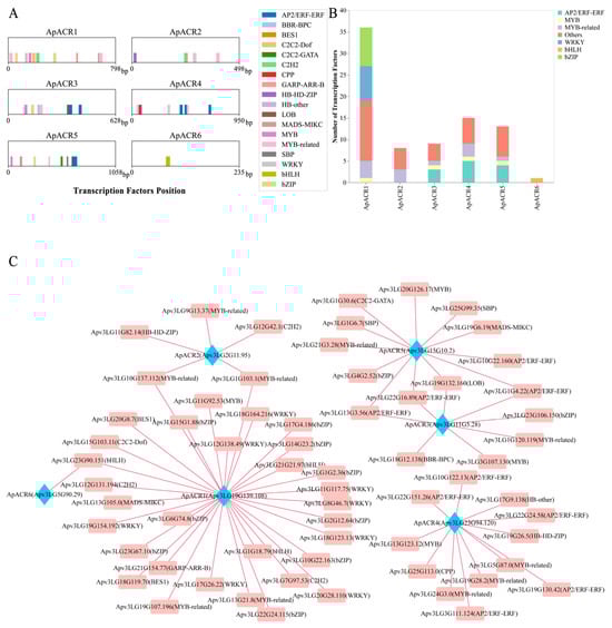 Bioinformatic prediction of TF binding sites and regulatory network of six candidate ApACRs in A. paniculata. (A) Prediction of TF binding sites in six ApACRs (ApACR1-ApACR6). TF families are distinguished with different colors. (B) Number of TFs and primary TF family types in each ApACR. (C) Interacting network of TFs-ApACRs. Blue diamond nodes represent ApACRs and their associated genes, and red square nodes represent transcription factors.