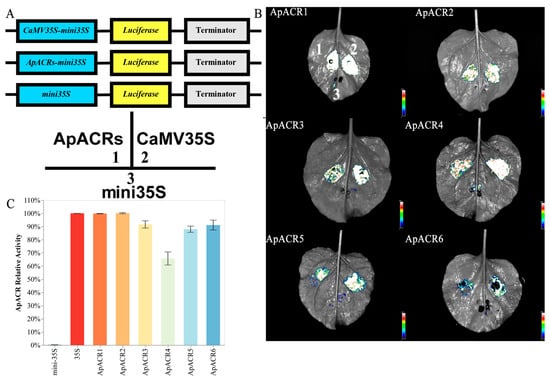 The transient expression assay of the activity of six ApACRs in tobacco leaves. (A) The structures of ApACRs-mini35S (marked in 1), 35S-mini35S (marked in 2), and mini35S (marked in 3) vectors. (B) The transcription activities of ApACRs assessed in tobacco leaves by the transient expression assay. Three constructs were used: ApACRs-mini35S (experimental group); 35S-mini35S as a positive control; and mini35S, a 46 bp truncated 35S promoter (negative control). The numbers 1,2,3 are shown in the lower panel of (A). (C) The relative transcriptional activities (LUC/REN) of the ApACRs. LUC represents firefly luciferase activity; REN represents renilla luciferase activity. Error bars represent the standard error of five biological replicates.